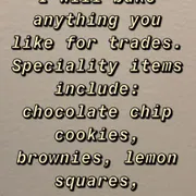 Recently moved to Hamilton! I live in the Crown point but I’m willing to travel for the right trade! Don’t really check likes, so if you want soemthing message me! Always happy to bake a batch of something in trade of another item. I make a MEAN lemon s... More