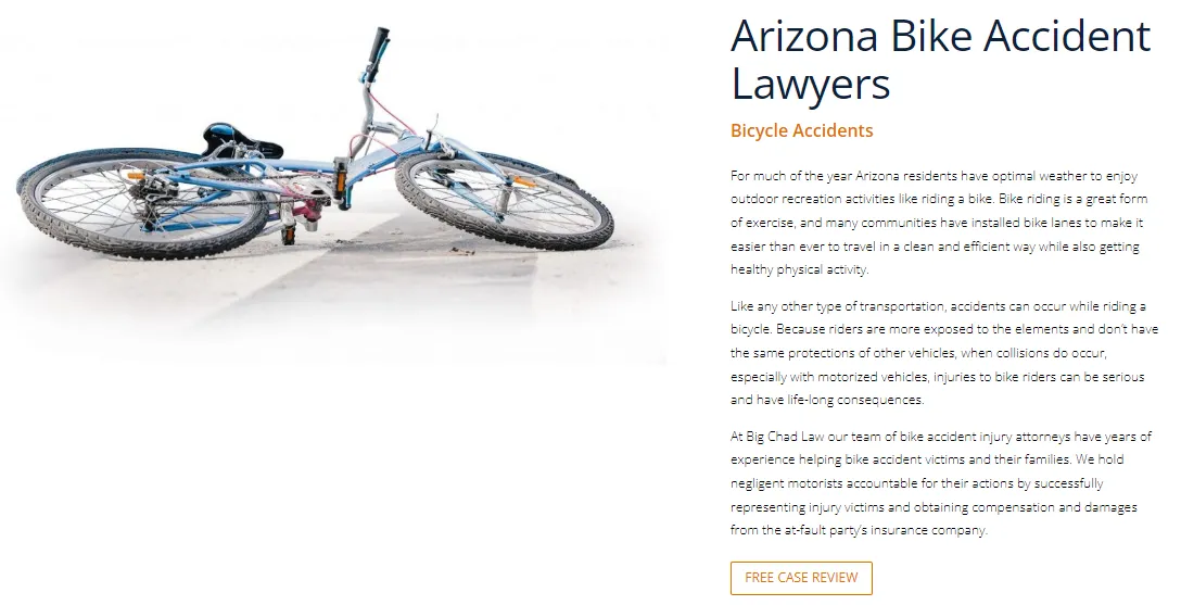 We Are Your Arizona Bike Accident Attorney. Located in Phoenix, Mesa and Chandler plus All Arizona. Contact Us For A Free Case Review Today. https://www.bigchadlaw.com/arizona-bike-accident-attorney/