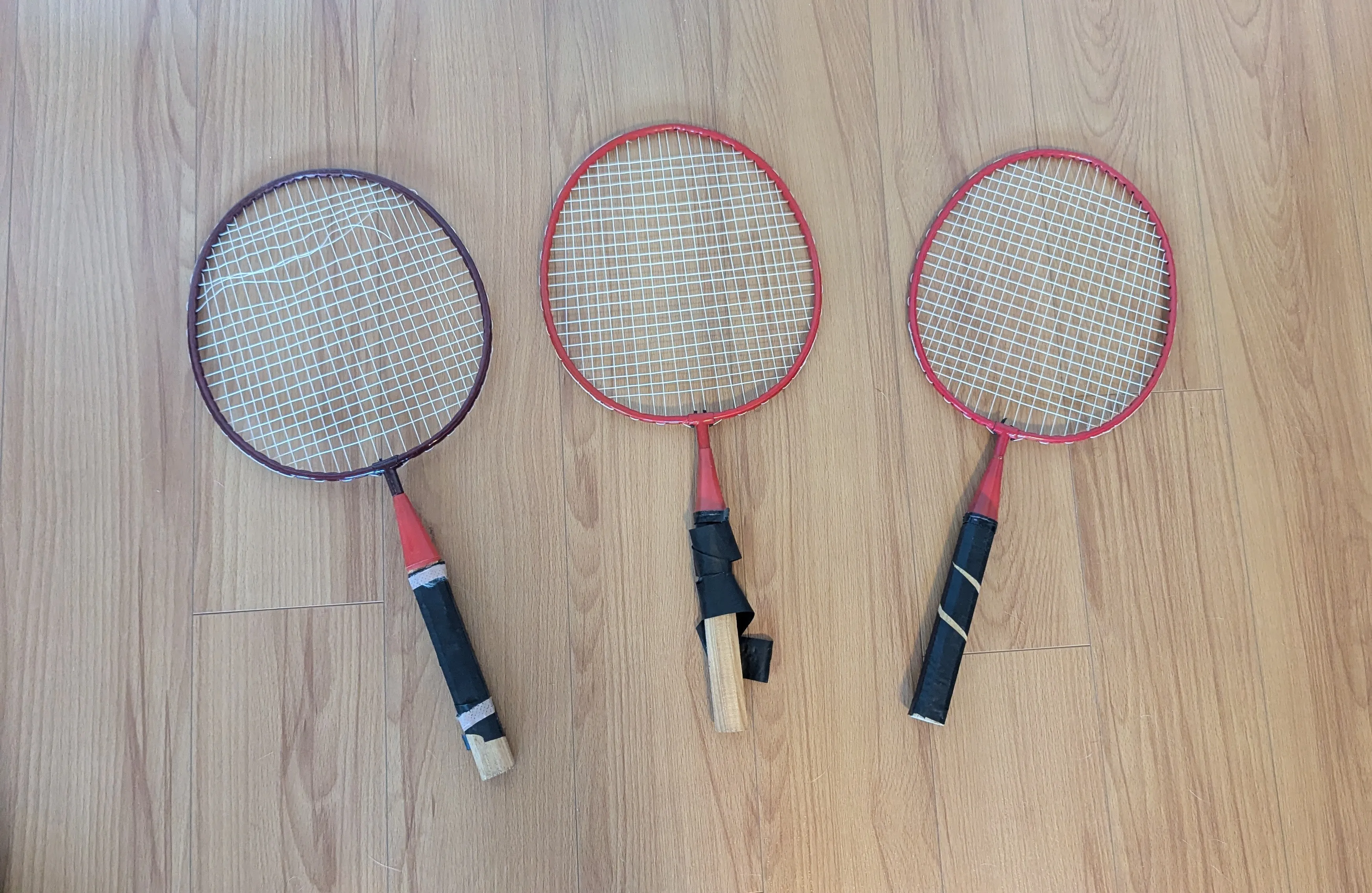 Set of 3 badminton racquets. Red frames with wooden handles. Some tape on handles.