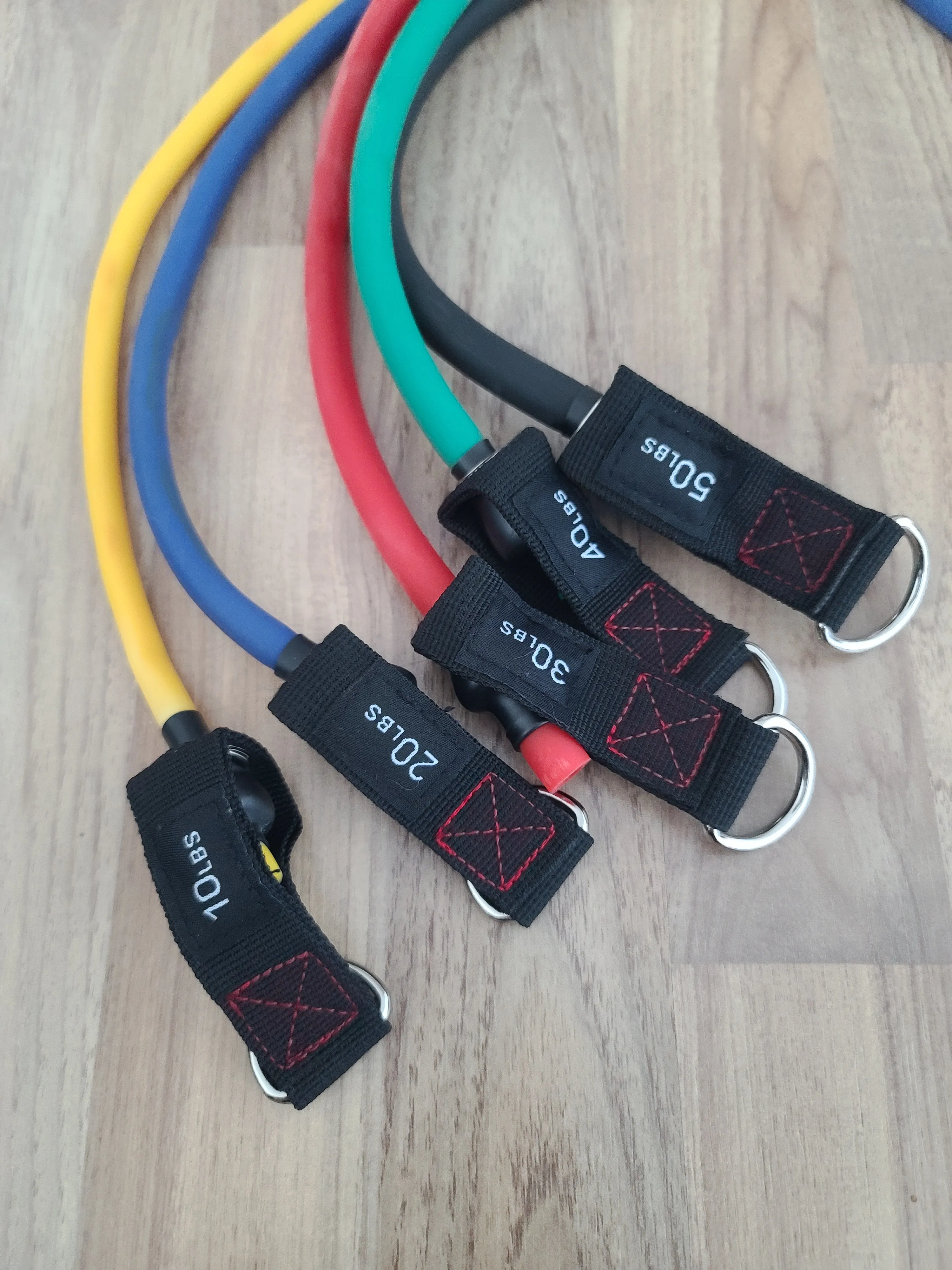 Set of 5 exercise bands, from 10lbs to 50lbs. Includes different handles and comes with the bag. EUC.
