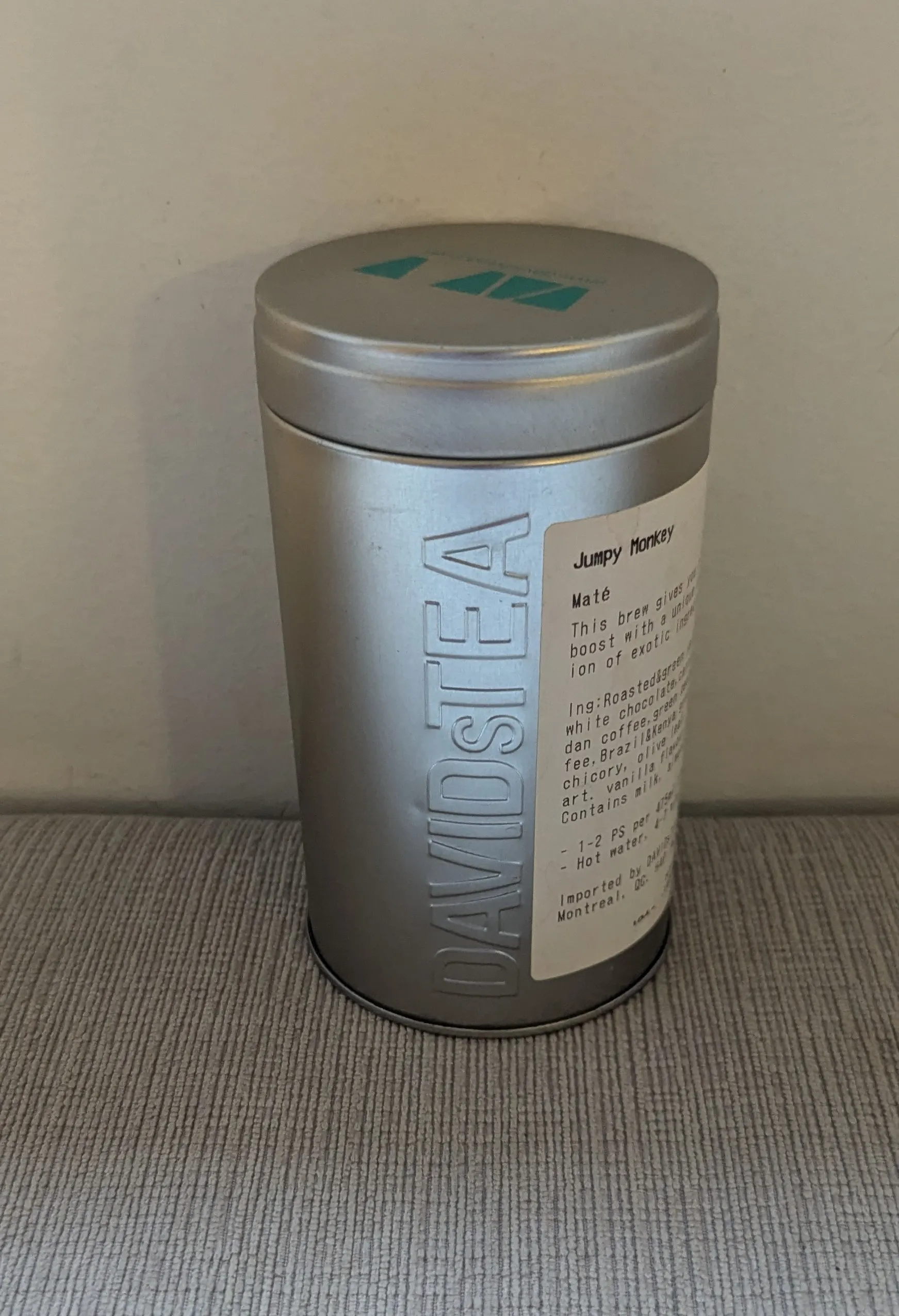 Empty tin from David's Tea. Silver, cylindrical, with a screw-on lid. Suitable for storing small items.