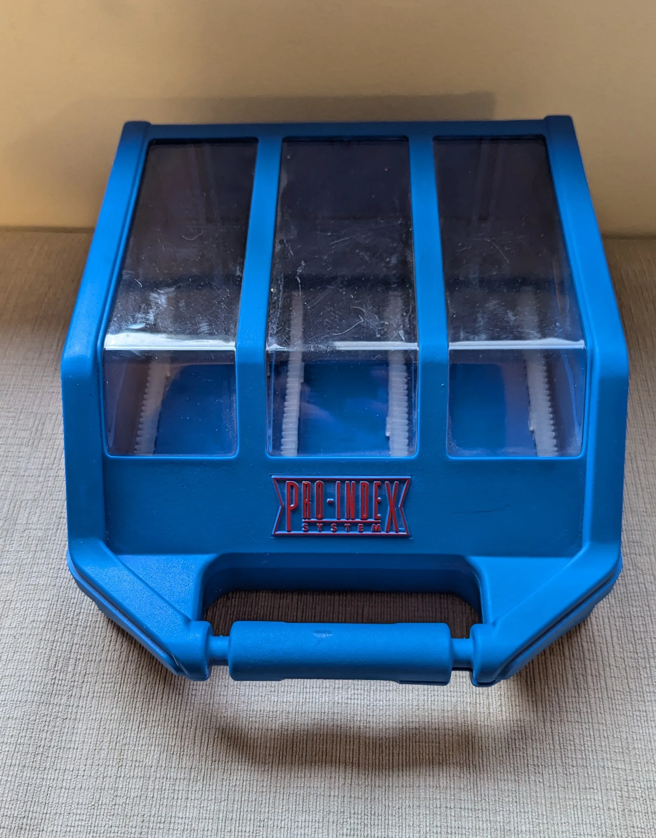 Blue plastic case with clear top, used to store cards. Comes with 183 card protective covers to display in case.