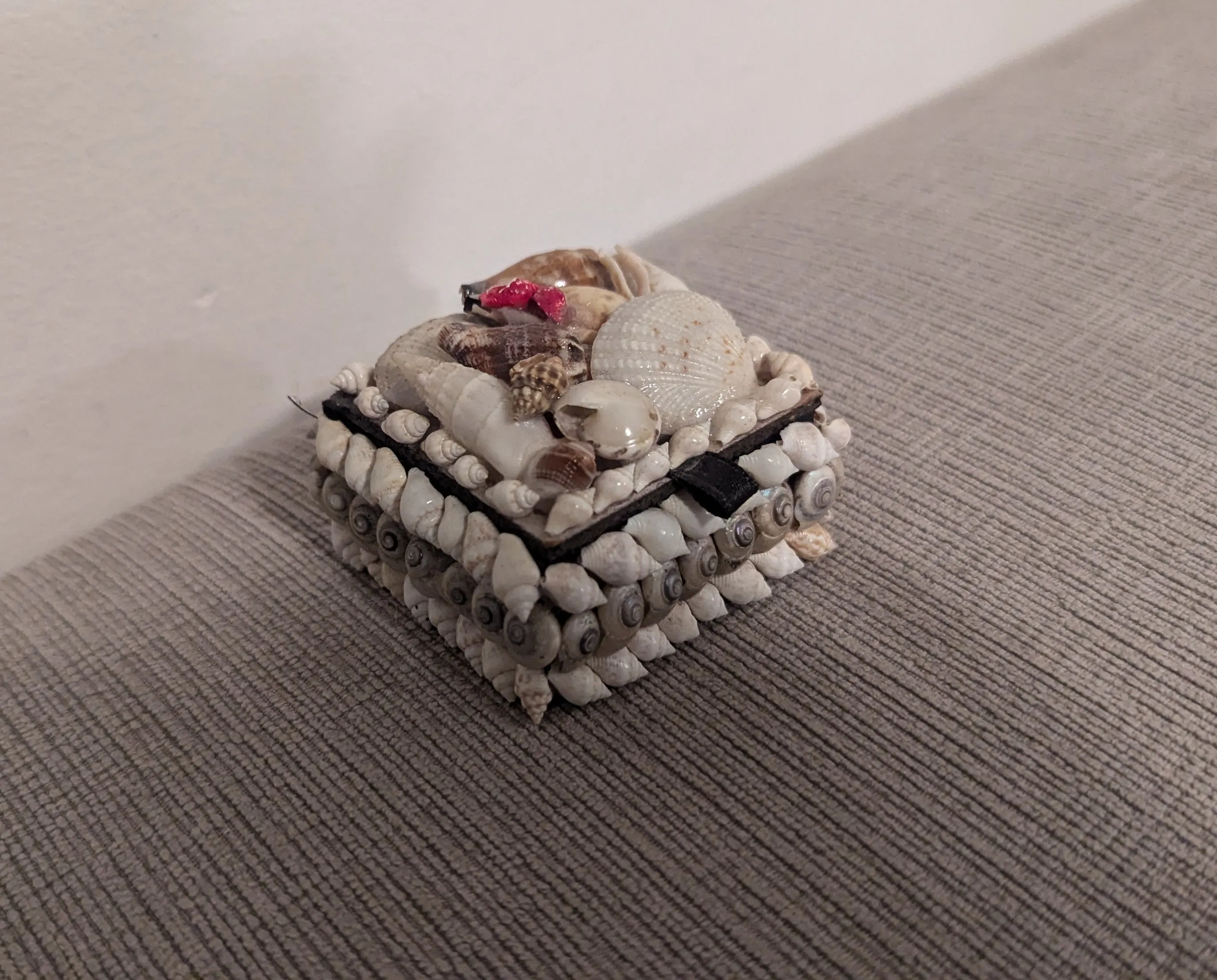 Small trinket box covered in seashells. Has a black velvet interior. Perfect for holding small treasures or jewelry.