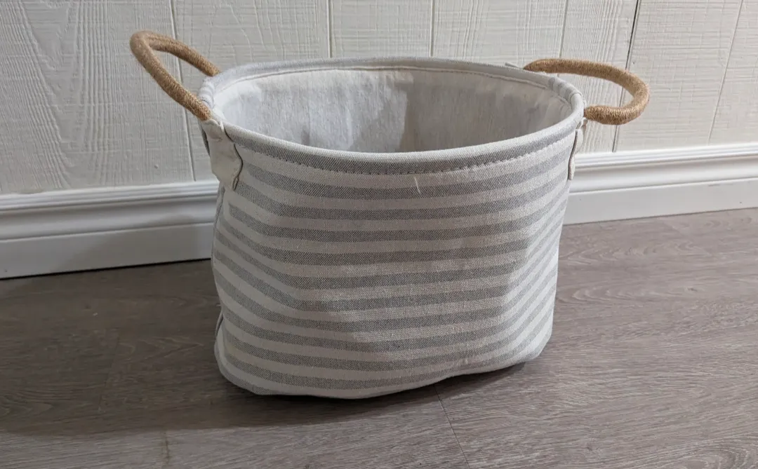 This is a cute striped storage basket, perfect for organizing toys, blankets, or laundry. It features sturdy rope handles for easy carrying. The basket has a neutral colour palette that would fit into any room decor. It's in great condition and ready for a new home!