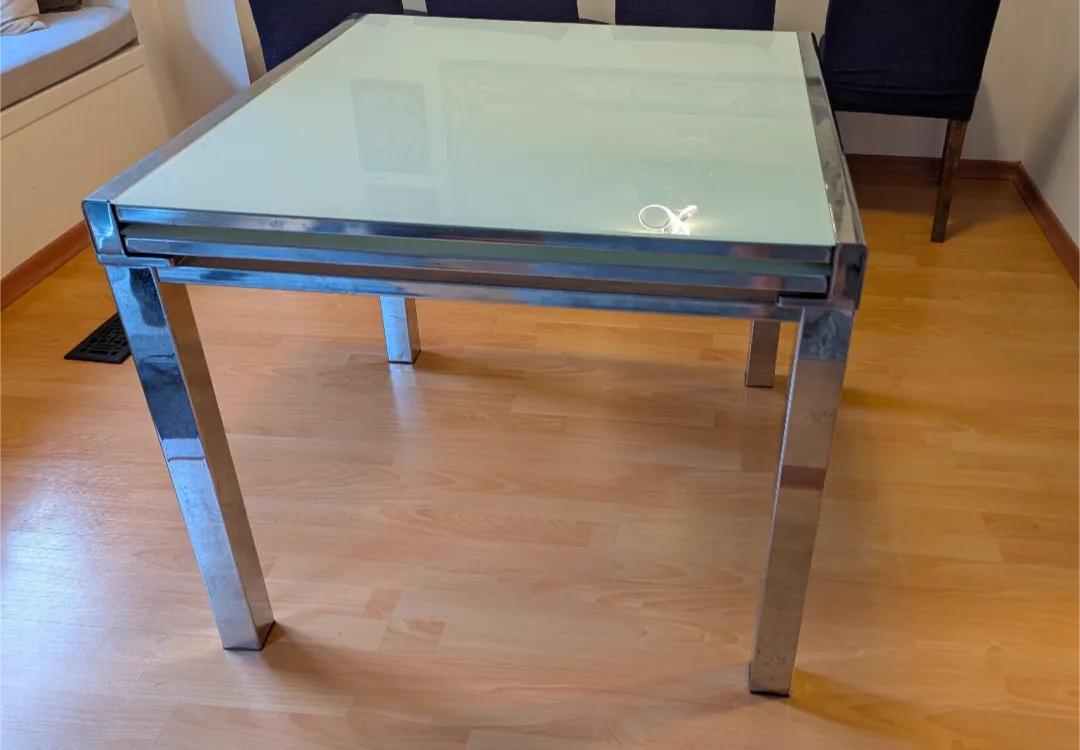 Selling a dining table with a stylish glass top and extendable feature! The frame is a shiny silver colour. Perfect for family dinners or entertaining guests, this table is both functional and chic