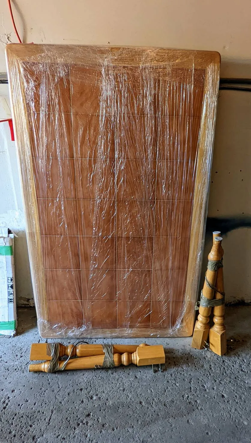 Excellent table that would be a great addition to your home. The photos show it disassembled as it's still wrapped in plastic wrap from our move and for easy transport.