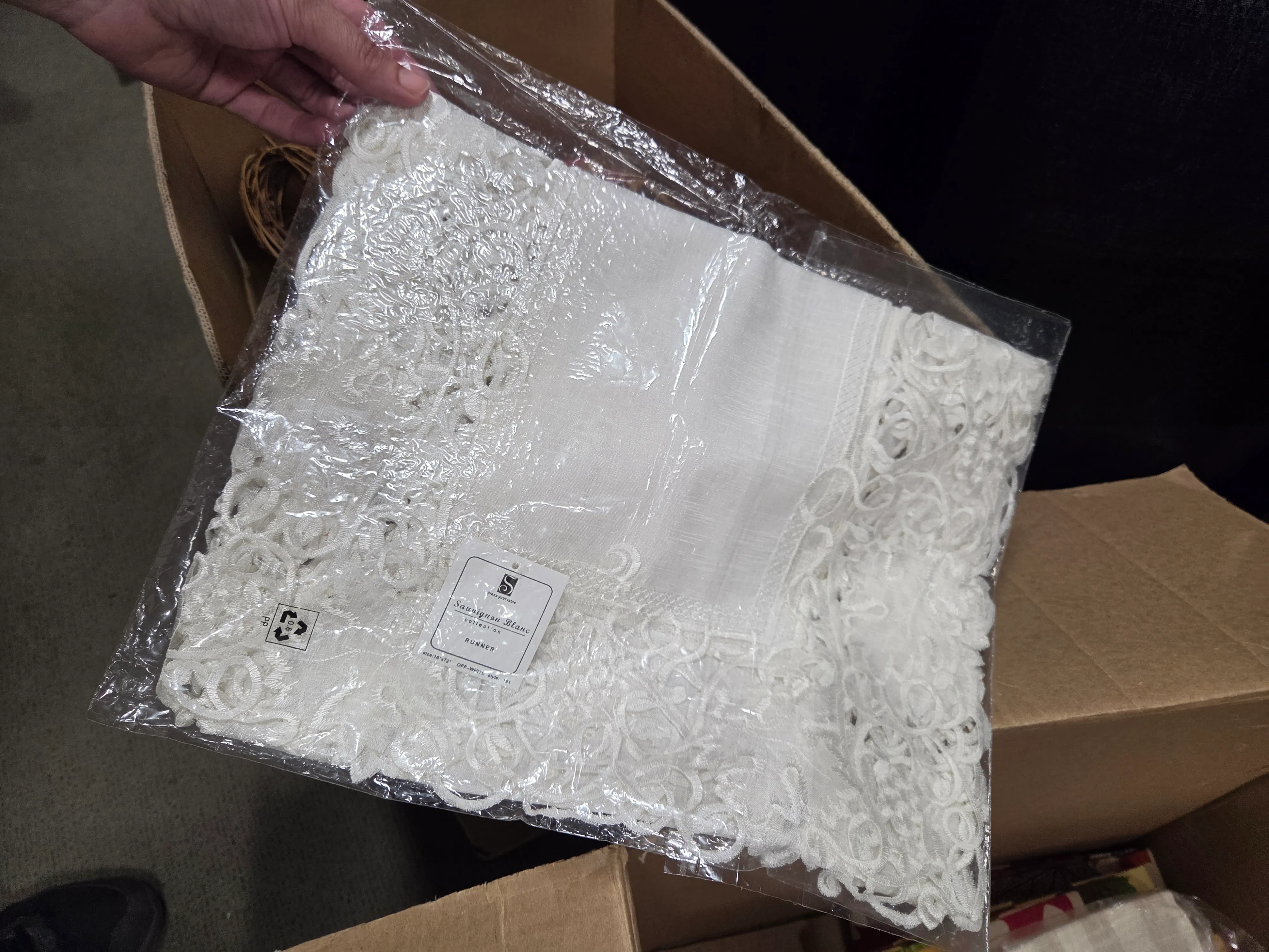 Beautiful woven style never used brand new giftable in package with subtle grape leaf and vine pattern in the edge. Whole thing is a white offwhite colour. Beautiful 71x16 inch