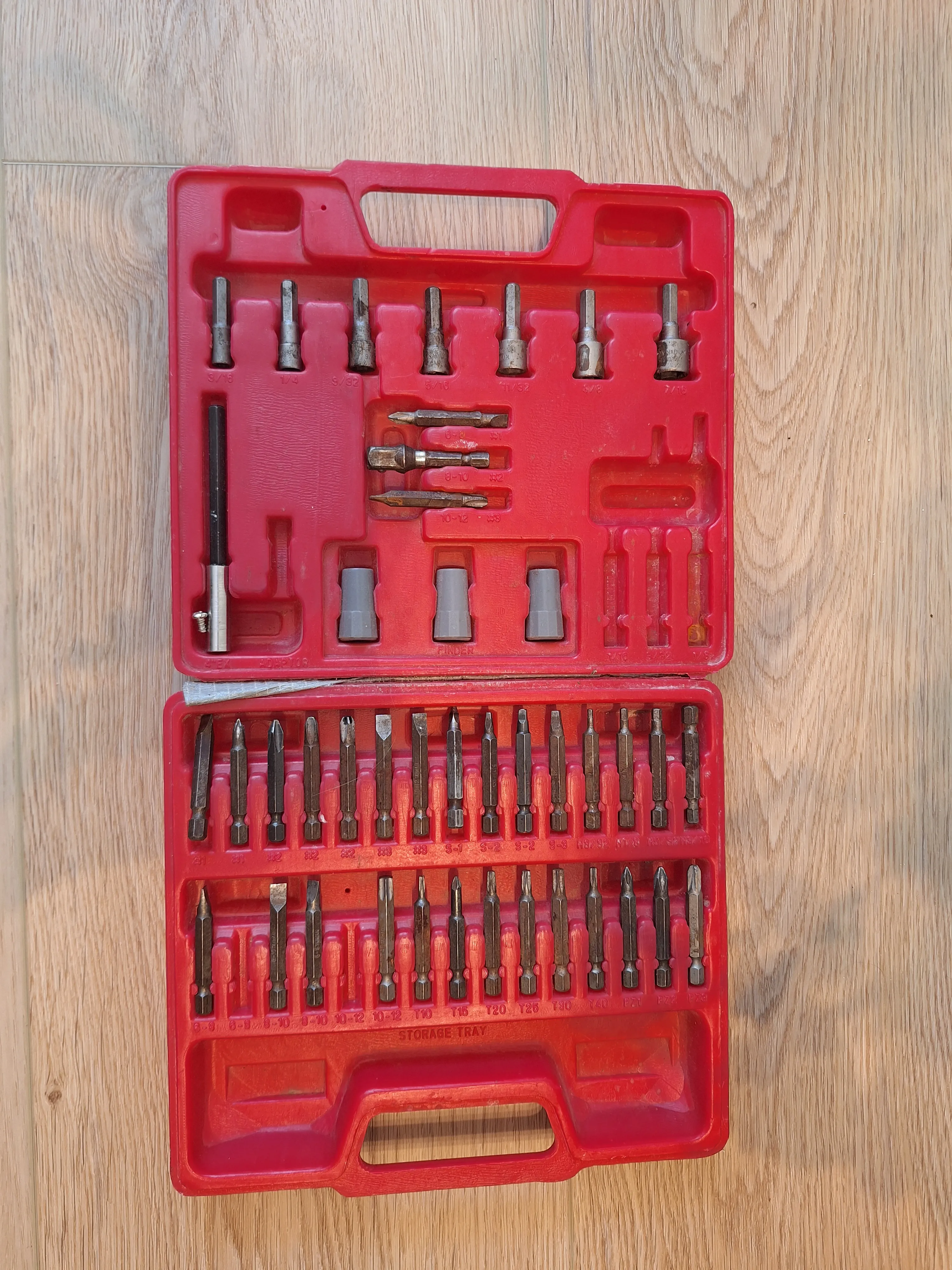 This driver set was a hand me down from my dad, so it is in well-worn condition. Despite rough appearances, it is a full driver set including all the common screwdriver head types you would typically need, a variety of nut drivers, and the hard plastic case shown no signs of degradation beyond cosmetic. The two sides of the case are held together with duct tape when open, but they snap together like usual when closed, so you never have to worry about it falling apart. These types of sets are typically expensive bought new, so as long as you don't mind a hardy and well used set, this will be a great find for any burgeoning handy-person, or to supplement a driver head collection that may be suffering from missing prices. Would not mind bundling this for the right offer.