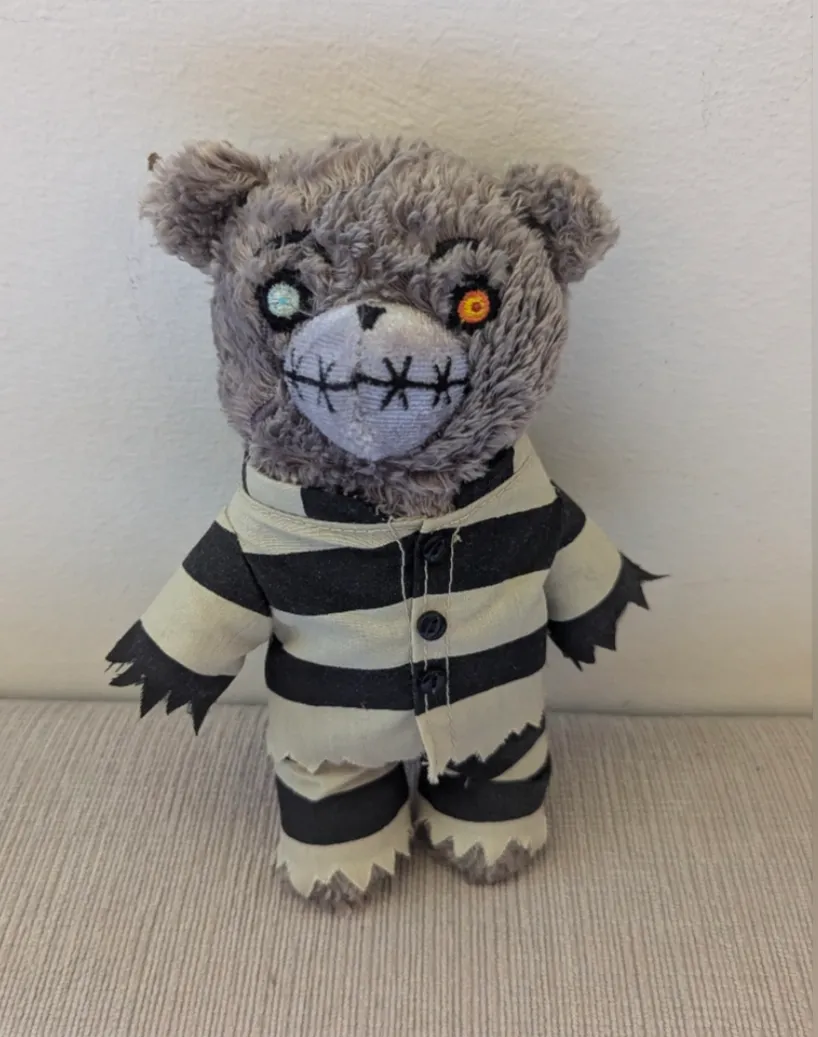Grey plush bear wearing a striped jumpsuit with a number on the back. The bear has one blue eye and one orange eye and a stitched up mouth.