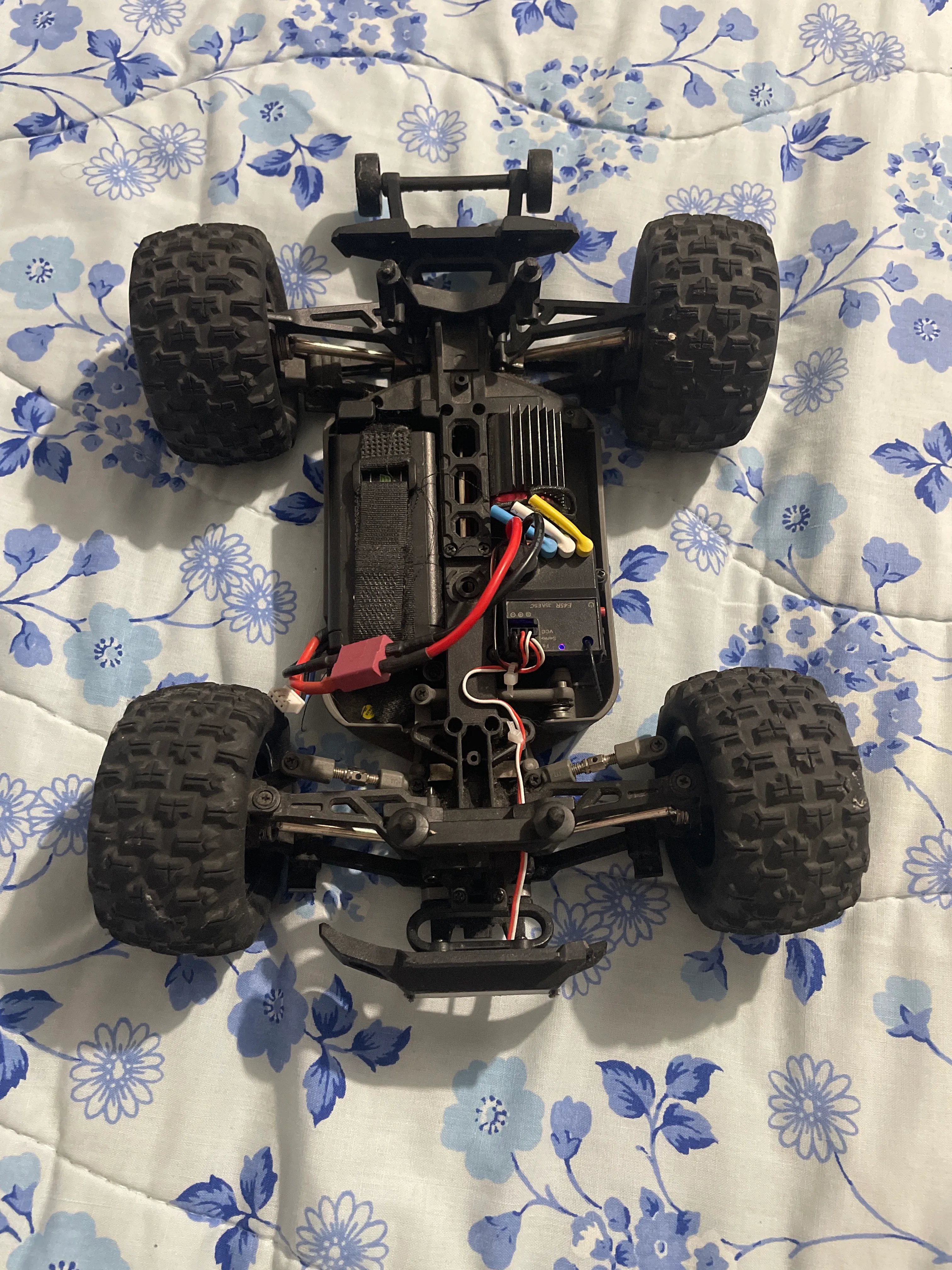 Battery works, indicator lights up. Missing remote. Some slight damage. As is. Needs a body and a frequency code to control the car. As is.