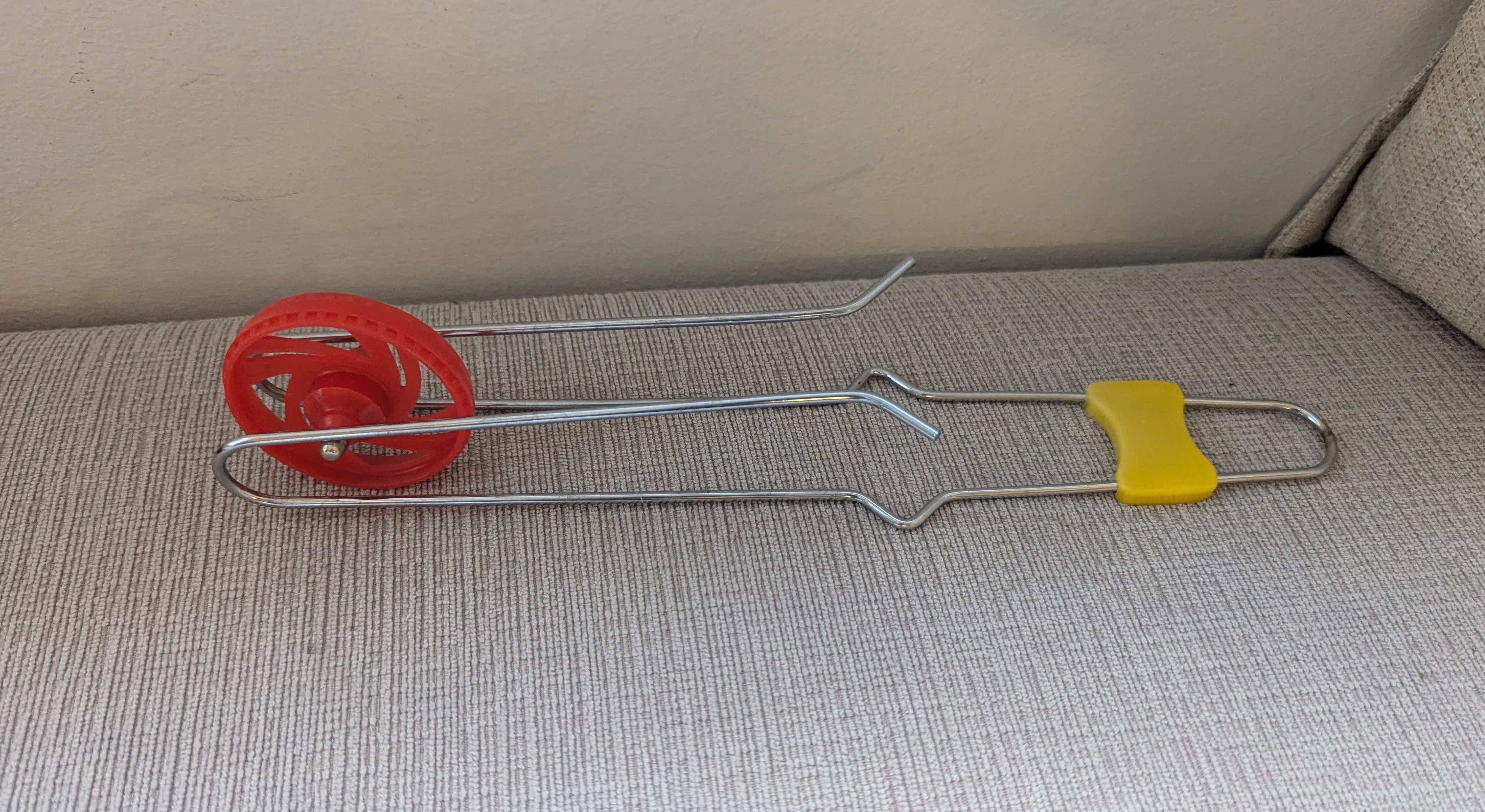Vintage toy with a red plastic wheel and a yellow handle. A unique find for collectors or anyone interested in classic toys!