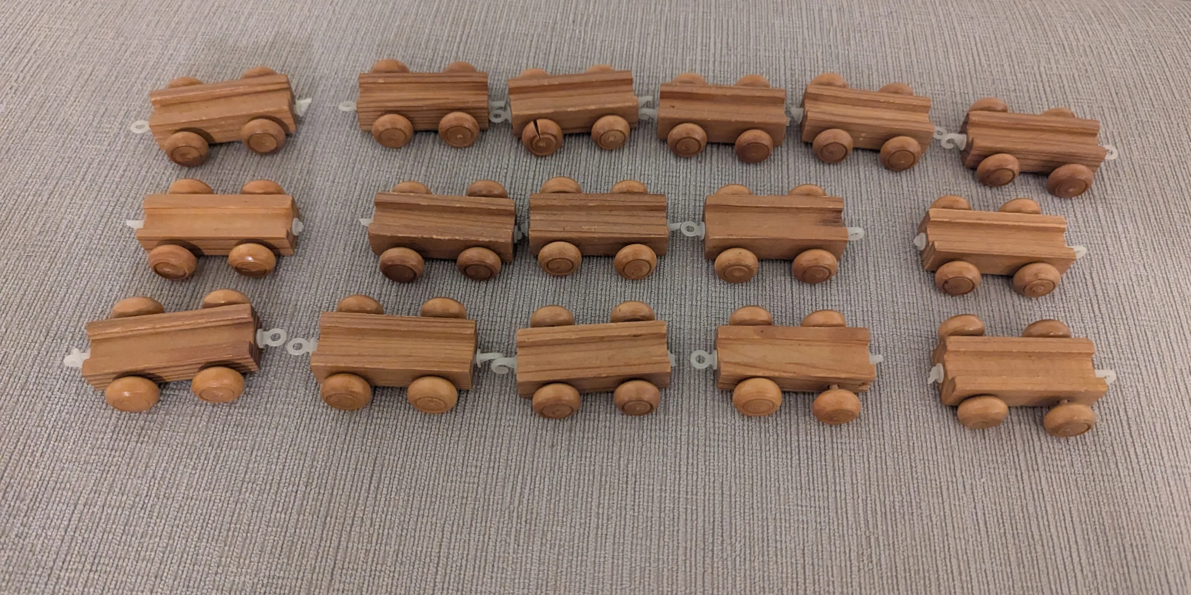 Set of 16 wooden train cars. Small size, ideal for young children. Natural wood finish. Simple design. Some of the plastic connector pieces are broken, but some are still intact, the wooden structure part of all pieces are in perfect condition.