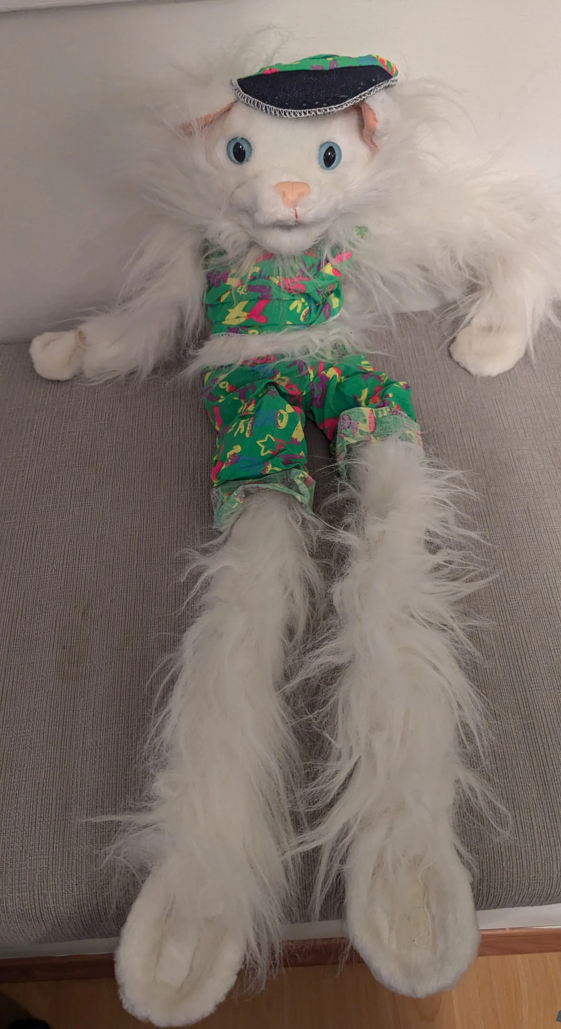 Large, white cat hand puppet with long arms and legs. Wearing a green and pink outfit and a blue hat. Great for kids!