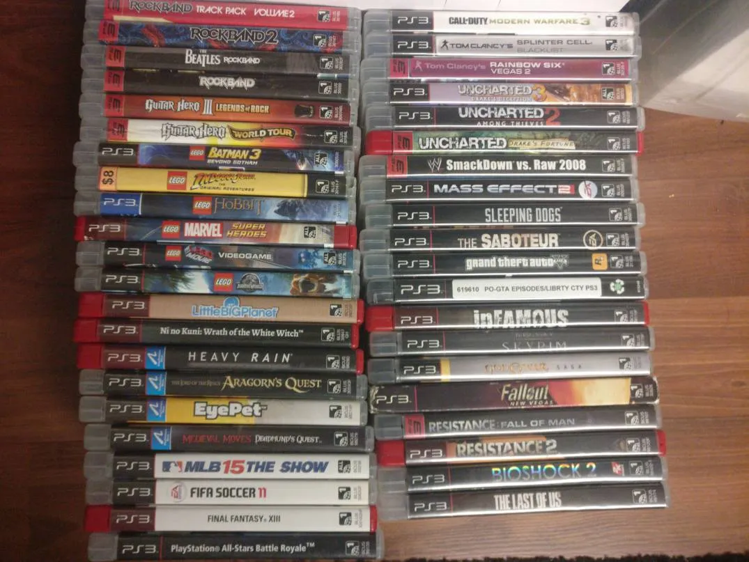 The Last of Us BioShock 2 - traded Resistance: Fall of Man Resistance 2 Fallout New Vegas - traded The Elder Scrolls V: Skyrim - traded InFAMOUS L.A. Noire - no original case/no manual - $5 Grand Theft Auto IV: Episodes from Liberty City - no original case/no manual - $5 Grand Theft Auto V The Saboteur - traded Sleeping Dogs Mass Effect 2 WWE Smackdown vs. Raw 2008 - traded MLB 15 The Show FIFA Soccer 11 Uncharted: Drake’s Fortune Uncharted 2: Among Thieves Uncharted 3: Drake’s Deception Final Fantasy XIII Playstation All-Stars Battle Royale Sports Champions - (PS Move compatible) Medieval Moves: Deadmund’s Quest - (PS Move compatible) Heavy Rain - (PS Move compatible) The Lord of the Rings: Aragon’s Quest - traded EyePet - (PS Move compatible) Little Big Planet LEGO: The Lego Movie LEGO: Marvel Super Heroes LEGO: Hobbit LEGO: Indiana Jones - traded LEGO: Batman 3 Beyond Gotham Guitar Hero: World Tour Guitar Hero: Legends of Rock Rock Band Rock Band 2 Rock Band Track Pack Volume 2 The Beatles Rock Band Tom Clancy’s Rainbow Six Vegas 2 Tom Clancy’s Splinter Cell Blacklist Call of Duty: Modern Warfare 3 God of War Saga (5 games) - traded Ni No Kuni: Wrath of the White Witch - traded